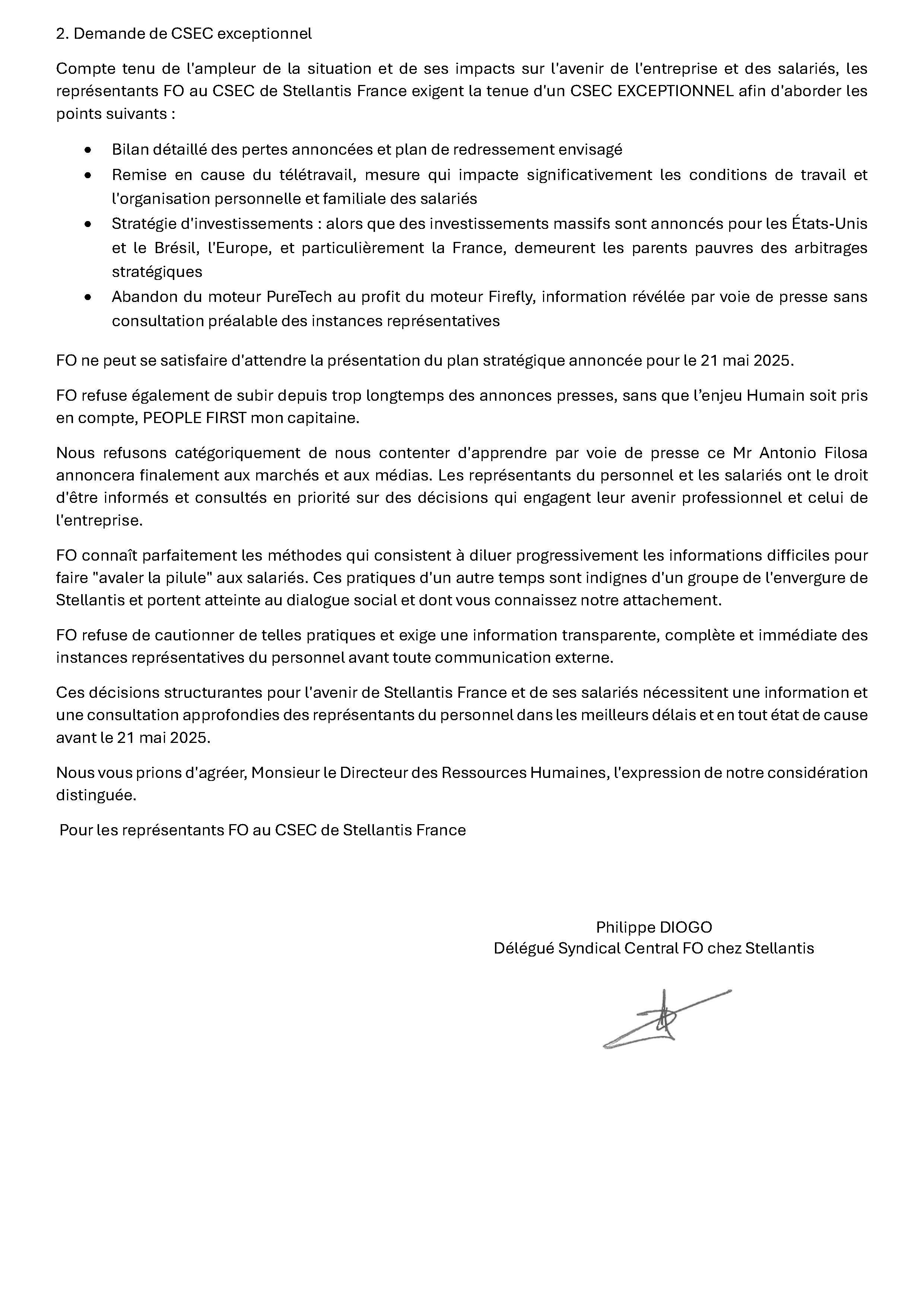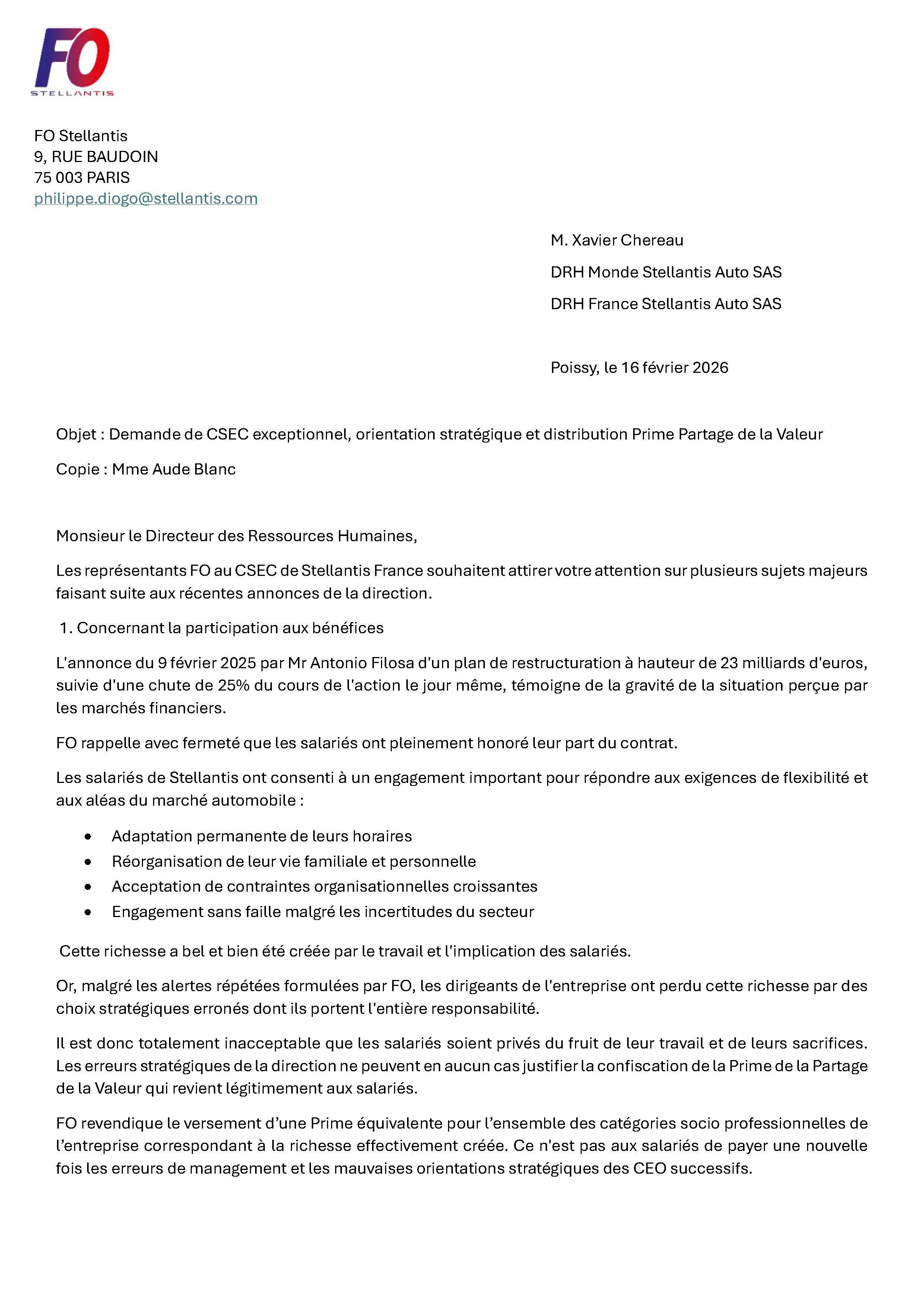 Courrier FO à la direction centrale