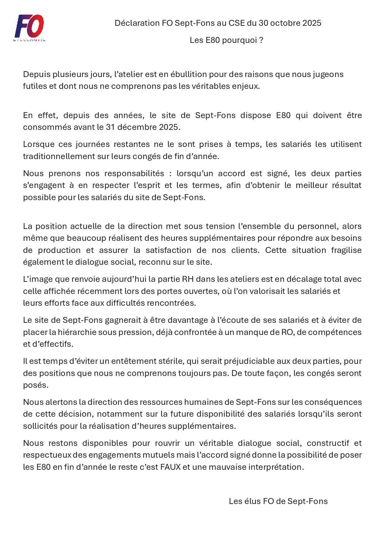 Déclaration FO en CSE concernant les E80 l'accord nous protège !
