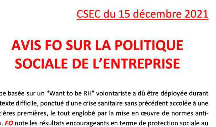 Avis FO sur la politique sociale du groupe.